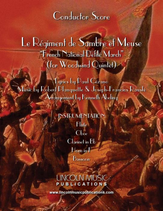 Le Regiment de Sambre et Meuse or, French National Défilé March as it commonly referred to in the U.S for Woodwind Quintet. Based on a poem/lyrics written by Paul Cézano and set to music by Robert Planquette then later arranged into a English style military march by Joseph-Francios Rauski. This is an early advanced level arrangement. The Playing time is approximately 2:40 with only the final strain repeated. A “turn-around”, D.C. and a D.S.s are available to further lengthen the piece of so desired. The MP3 and video do not include these but the score and parts do. |